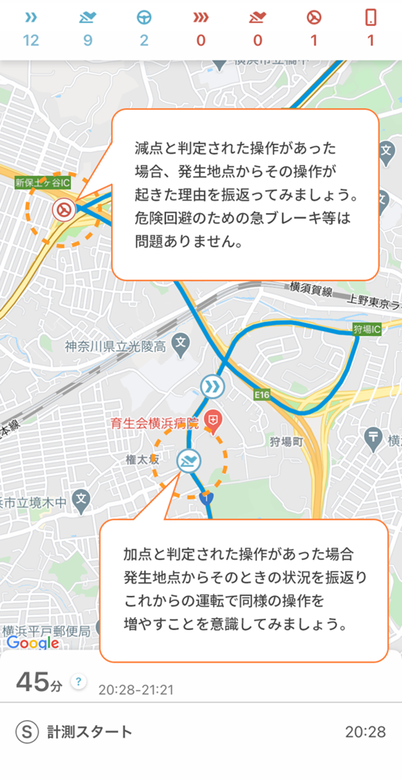走行開始地点(Sマーク)は、計測を開始してからはじめて位置情報を取得できた場所を表示しているため、実際に運転を開始された場所とは異なることがあります。