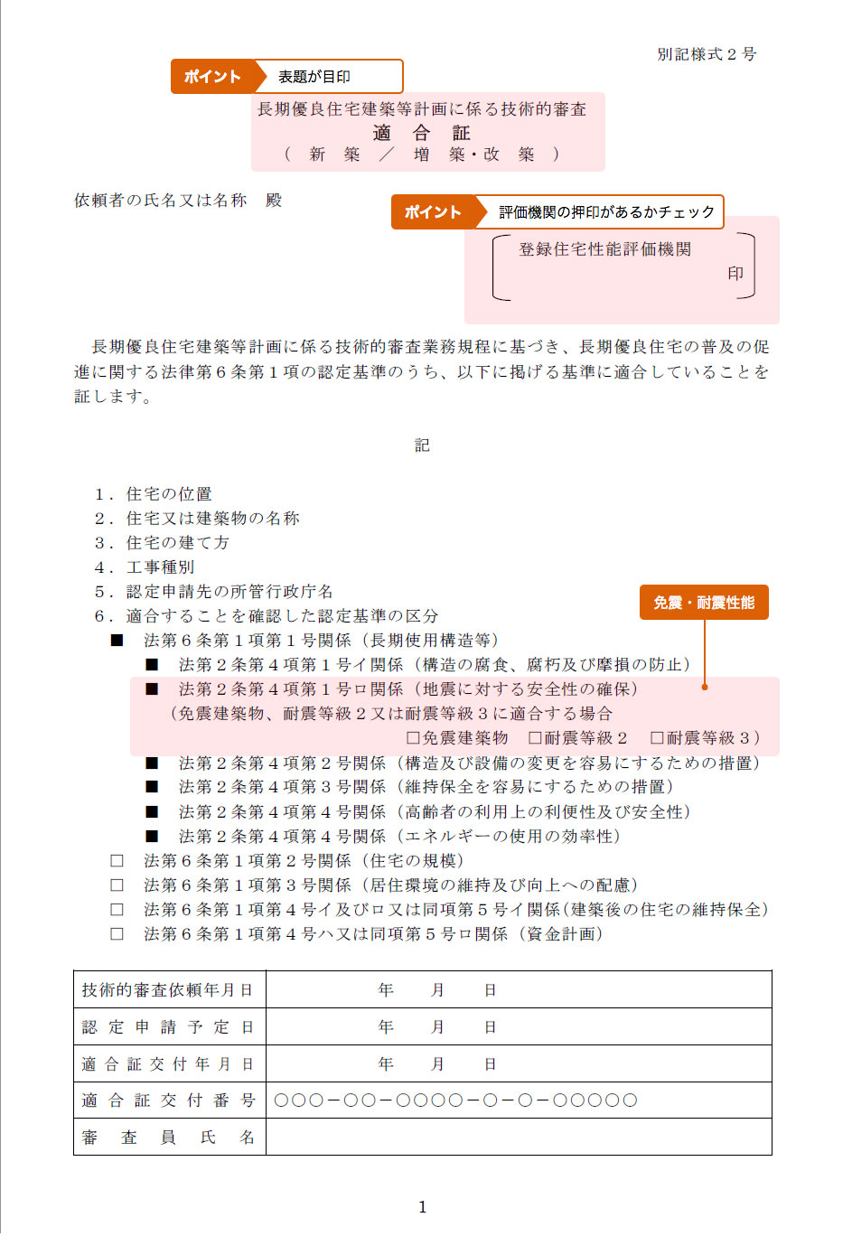 登録住宅性能評価機関より、長期優良住宅法および住宅の品質確保の促進等に関する法律(2022年2月20日施行)の改正前は適合証が、改正後は確認書が交付されています。