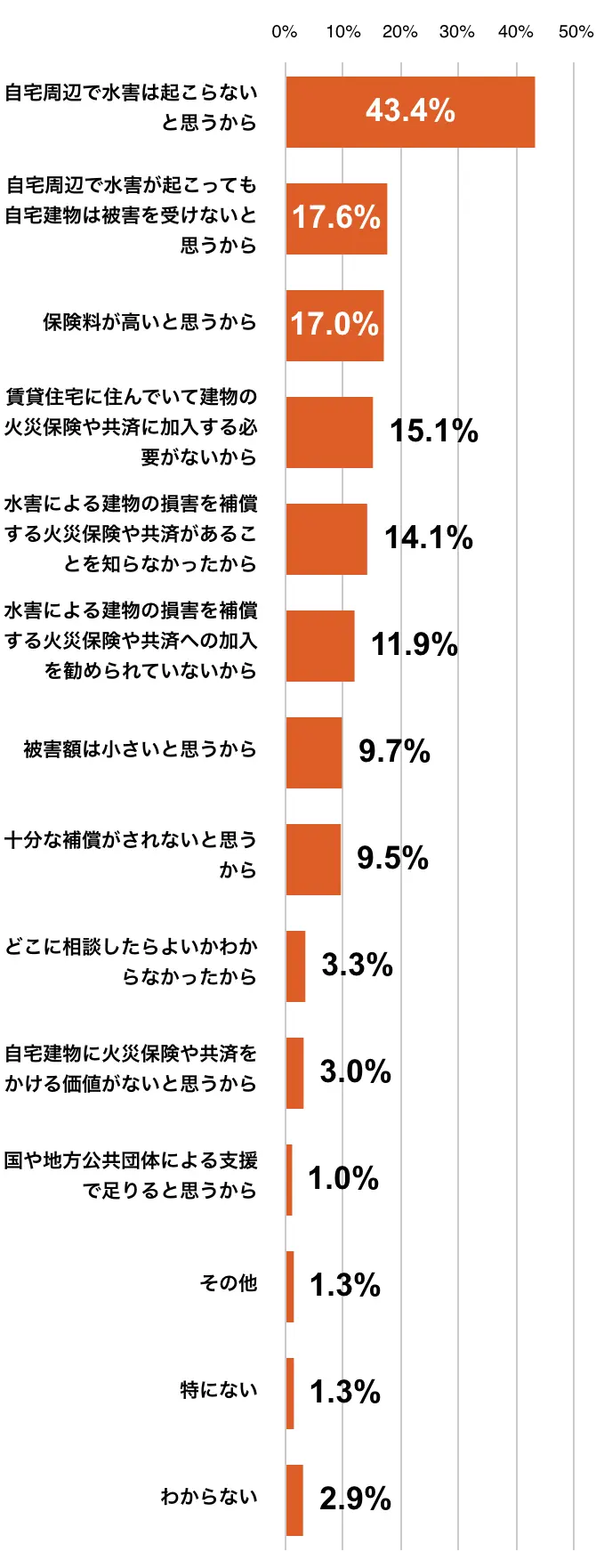 また、平成28年の調査では、水災を補償する火災保険や火災共済に加入していない人にその理由を問うと、約43%の人が「自宅付近で水害は起こらないと思うから」と回答しています。次に多いのが「自宅周辺で水害が起こっても自宅建物は被害を受けないと思うから」という結果でした(グラフ参照:内閣府調査(調査期間:平成28年1月7日〜17日))。