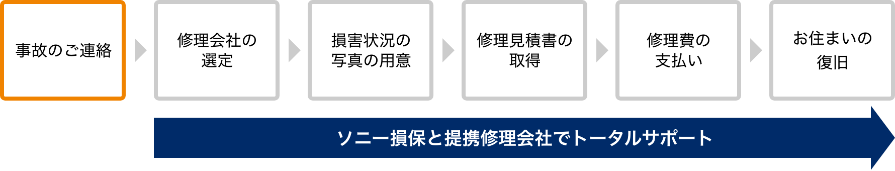 本サービスでは、お客様が希望される場合、事故のご連絡以降にかかるお客様の手間を省けるよう、修理会社の紹介からお住まいの復旧までを提携修理会社とソニー損保でトータルにサポートします。