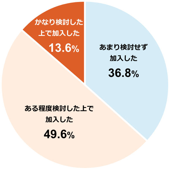 また、火災保険の加入時にどの程度、プラン内容について検討したかという質問では、「あまり検討せずに提案された内容で加入した」と回答した人が、戸建て派25.4%に対して、マンション派が36.8%と10ポイント以上高くなっており、戸建て派のほうがプランの内容を吟味する傾向が強いことがわかります。